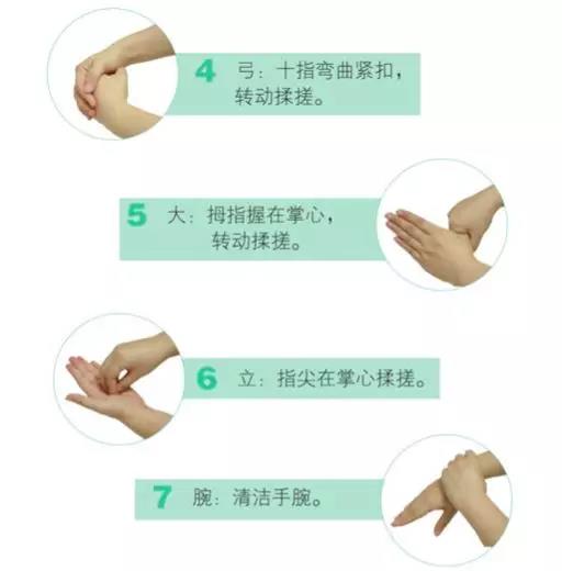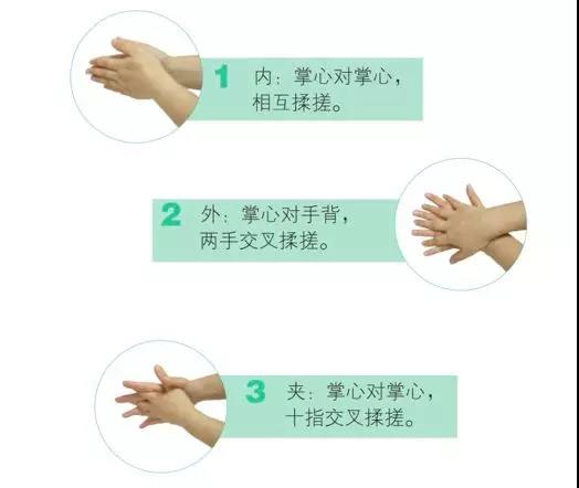 为了方便记忆,揉搓步骤可简单归纳为七字口诀:内—外—夹—大—立—腕。